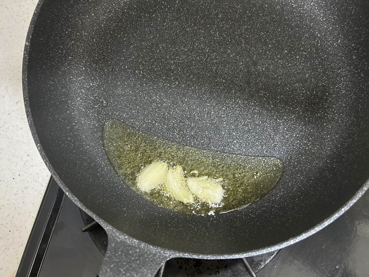 フライパンにオリーブオイルを少し入れて、スライスしたにんにくで香りづけ。