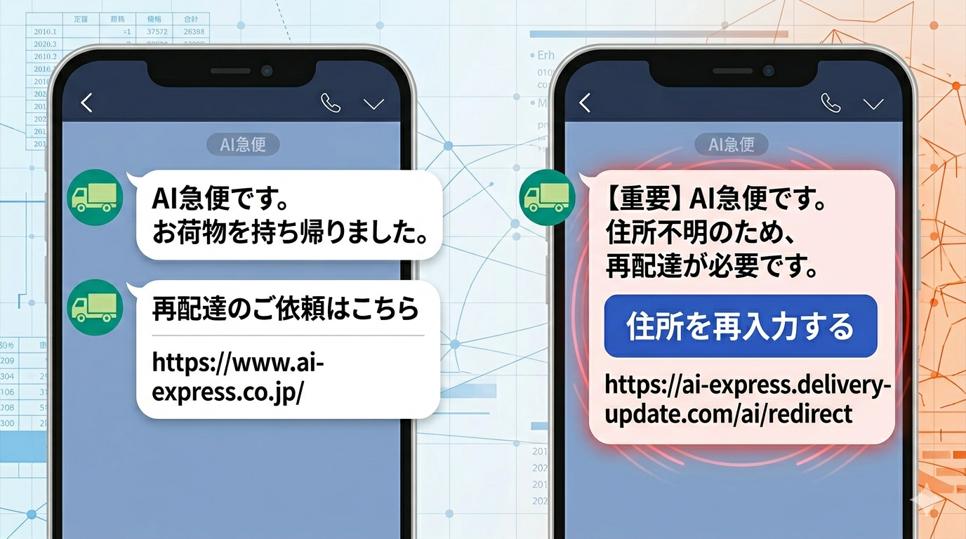 銀行や配送業者など、正規の送信元と同じ名前で届くことで、