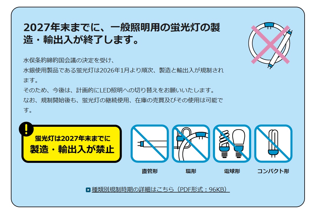 2027年末までに、一般照明用の蛍光灯の製造・輸出入が終了します。