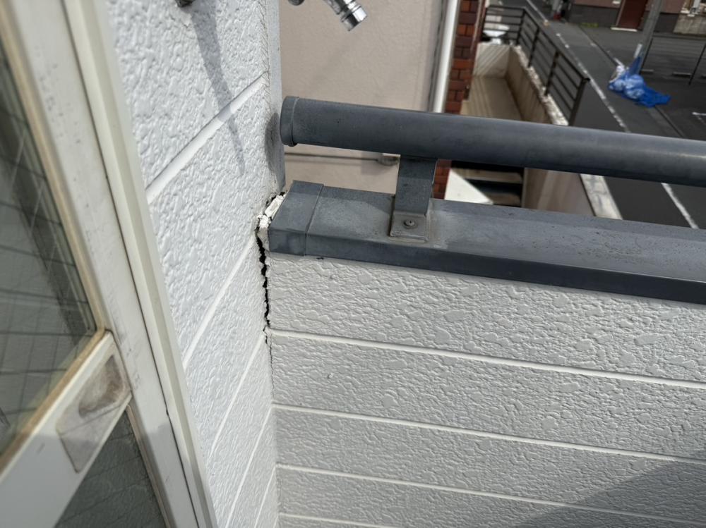 バルコニーと躯体の接続部分には亀裂が生じ、わずかに傾きが